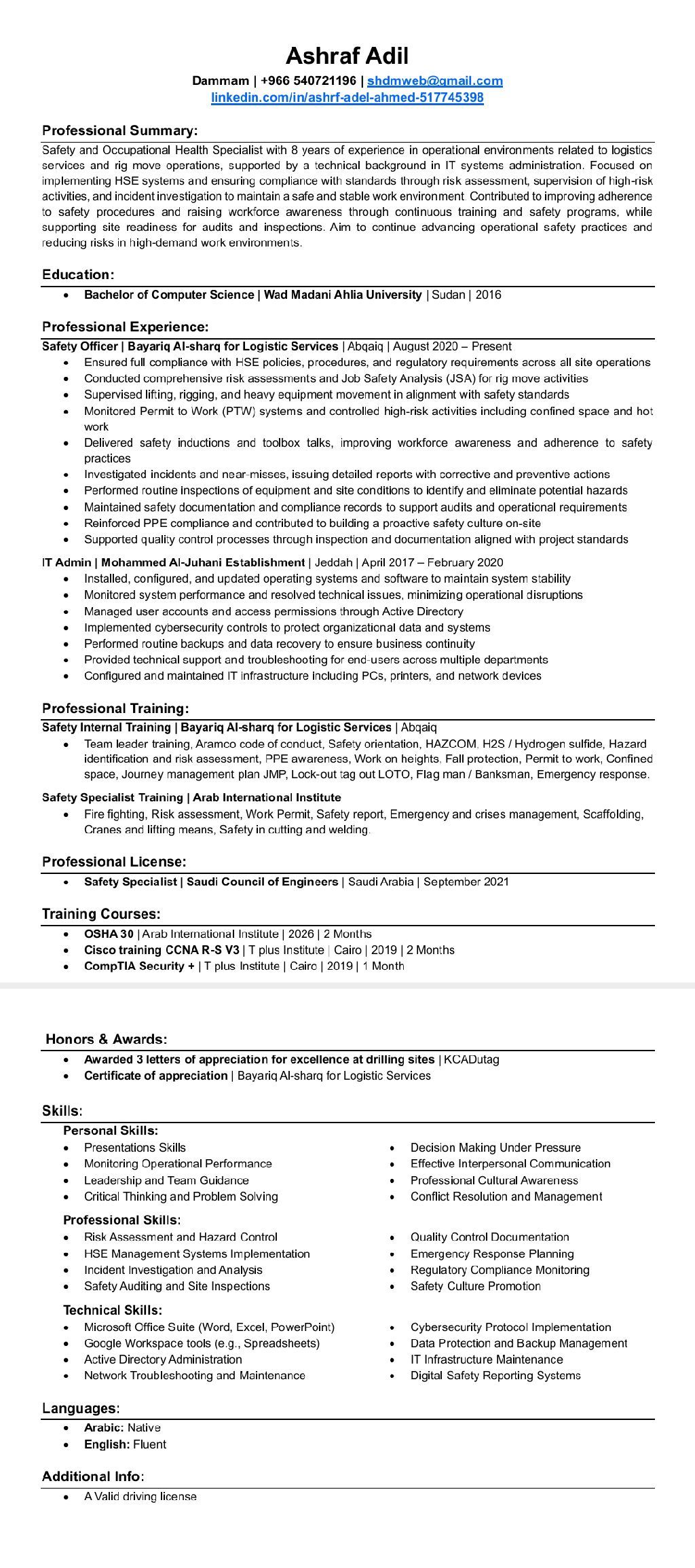 Safety Officer (Rig Move) with over 5 years of experience in safety within rig move operations. OSHA certified (online) Strong background in implementing safety procedures, risk assessment, incident investigation, permit to work systems, conducting toolbox talks, and employee training. Proven ability to ensure compliance, minimize risks, and improve safety on site. Valid Iqama and driving license