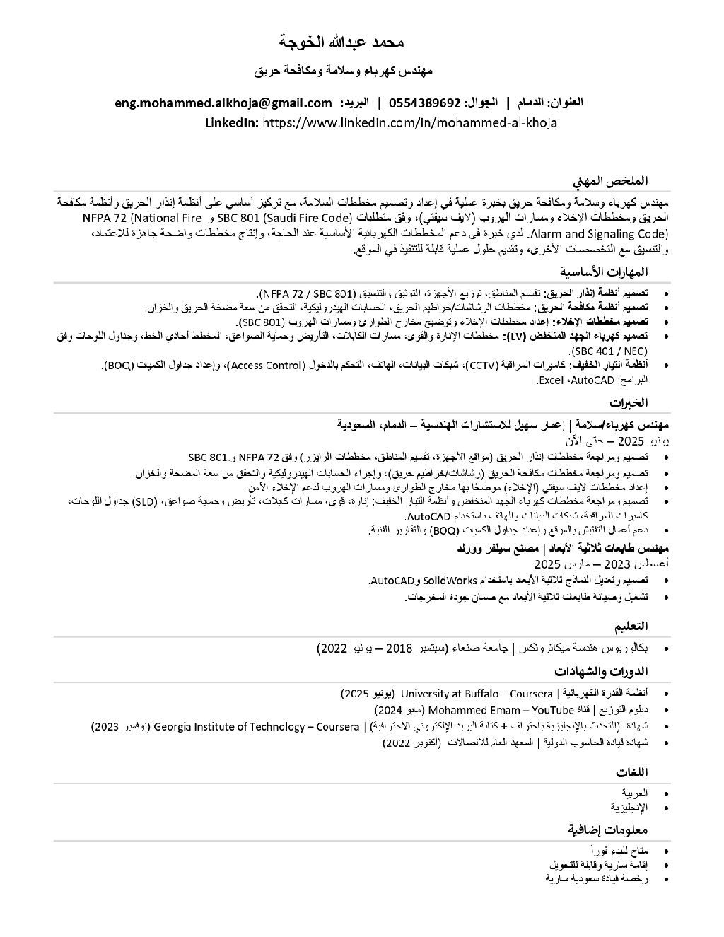 مهندس الكتروميكانيك، لدي خبرة في أعمال التصميم والمراجعة لمخططات السلامة وأنظمة الحريق، مع معرفة جيدة باشتراطات الكود واجادة استخدام AutoCAD. ابحث عن فرصة عمل مناسبة لتطوير خبرتي والمساهمة بكفاءة في مشاريع السلامة والحماية من الحريق. متاح للعمل فورا - اقامة قابلة للتحويل - رخصة قيادة سعودية سارية
