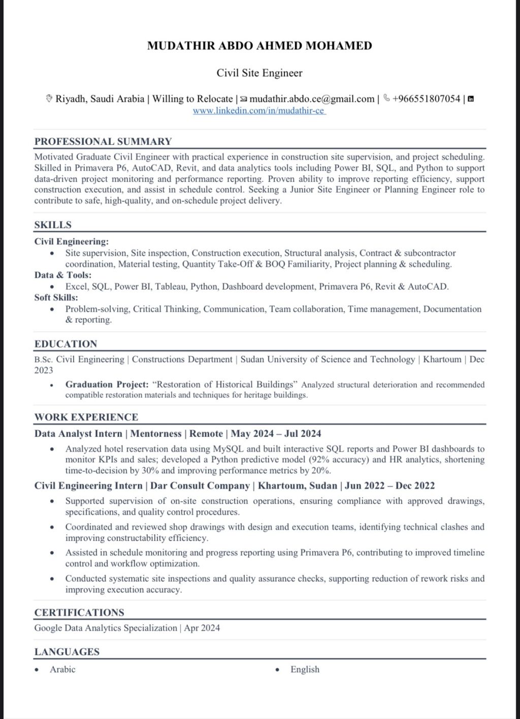Motivated Civil Engineer seeking a Junior Site Engineer position in Riyadh or across Saudi Arabia. Skilled in Primavera P6, AutoCAD, Revit, Excel, and Power BI, with practical experience in site supervision and project scheduling. Available immediately and willing to relocate