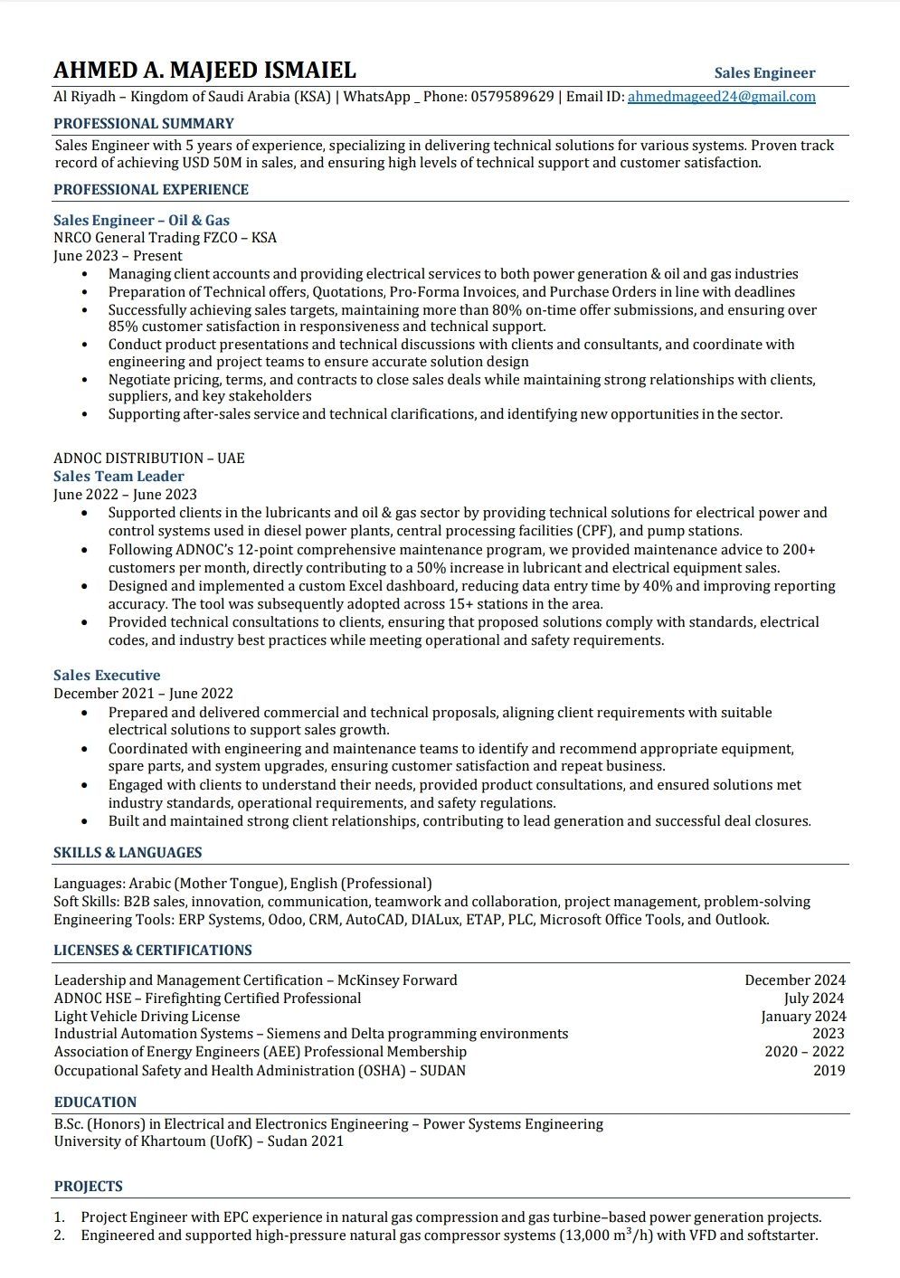 Sales Engineer, specialized in electrical and mechanical projects, I have previous experience in oil and gas industry and electromechanical projects. I hold a valid transferable Iqama and ready to excel/ relocate anytime