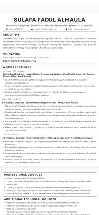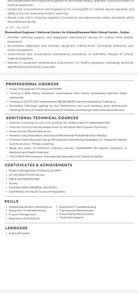 مهندسة اجهزة طبية بخبرة تزيد عن 11 عاما في القطاع الصحي أبها حاصلة على شهادة إدارة المشاريع الاحترافية PMP وحاصله على تصنيف مهندس محترف من جمعية المهندسين السعودية ذو خبرة قوية في إدارة الفرق وتنسيق أعمال الموردين وتحسين وتطوير المرافق الطبية واستمرارية الخدمة وسلامة الاجهزة والقدرة على قيادة الفرق أسعى لتولي دور قيادي في ادارة مشاريع وتشغيل المرافق الصحية ورفع كفاءة الخدمات الصحية