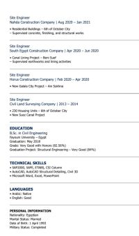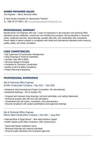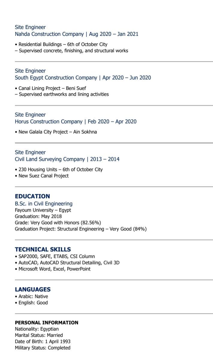 Civil Engineer (Site & Technical Office) Immediate Transfer 7 + years of experience in residential, commercial, and infrastructure projects. Expert in structural execution, Shop Drawings, Quantity Surveying (QS) per Saudi Building Code (SBC) and time scheduling. Software Proficient in AutoCAD, ASD, and MS Office. Knowledge of (SAP, ETABS, SAFE) and Civil 3D. Ready for immediate Iqama transfer