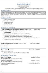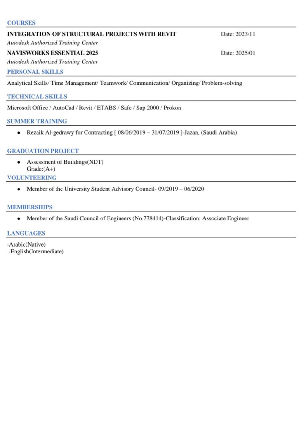 مهندس تصميم انشائي - الأول على الدفعة (بتصنيف مشارك - معتمد في الهيئة السعودية للمهندسين) خريج جامعة حكومية لعام 2020 - 2021 بمعدل 4.95 / 5 (الأول على الدفعة) خبرة 5 + سنوات داخل المملكة العربية السعودية في التصميم الانشائي للمشاريع الخرسانية السكنية والتجارية. أجيد العمل على برامج التصميم الانشائي CSI (ETABS, SAFE, SAP2000) وProkon. Revit وAutoCAD واعداد النوتات الحسابية