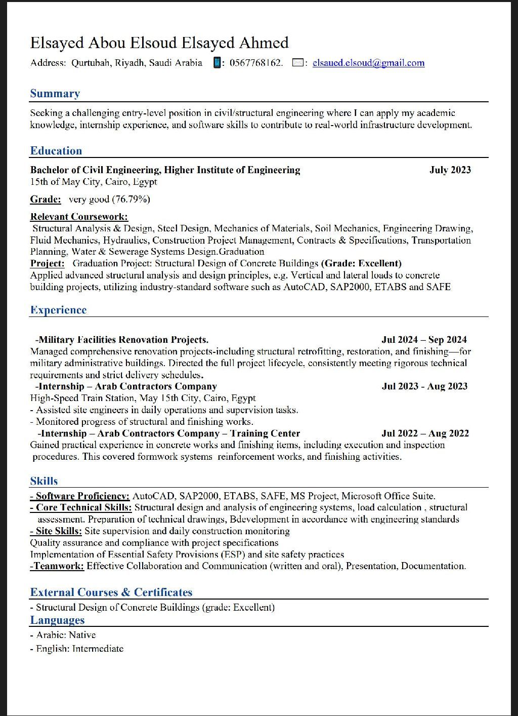 مهندس مدني حاصل على بكالوريوس هندسة مدنيه سنة 2023 لدي خبرة في التنفيذ الخرسانات والتشطيبات ولدي خبرة في استخدام برامج التصميم الانشائي متواجد حاليا في الرياض ومستعد لتنقل داخل المملكة