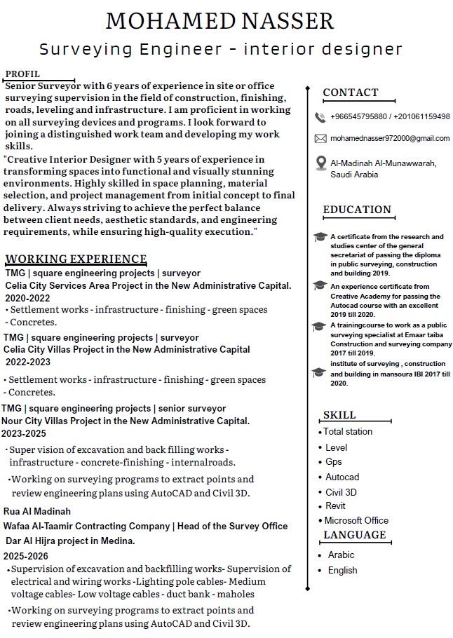 مهندس مساحة مكتب وموقع خبرة 6 سنين قيادة فريق العمل والاشراف علي الأعمال المساحية في مجال الانشاءات - الطرق - اللاند سكيب - التشطيبات - أعمال الحفر والردم والتسويات - البنية التحتية medium voltage cable - low voltage cable - Duct Bank - manhole. أجيد العمل على جميع الاجهزة والبرامج المساحية ومصمم داخلي خبرة 5 سنوات امتلك مهارة عالية في تخطيط المساحات وتحويلها الى بيئة وظيفية جذابة