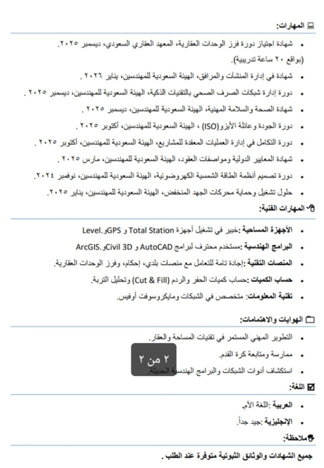 مساح عام خبرة 5 سنوات في السوق السعودي خبرة في استخدام جميع الاجهزة المساحية واستدام البرامج الهندسية مثل الاوتوكاد والسيفل والارك ماب ابحث عن فرصة عمل في مكتب هندسي أو شركة مقاولات