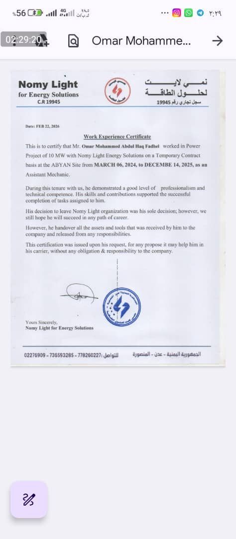 أنا مهندس ميكانيك ابحث عن عمل وهذا شهادة خبرتي