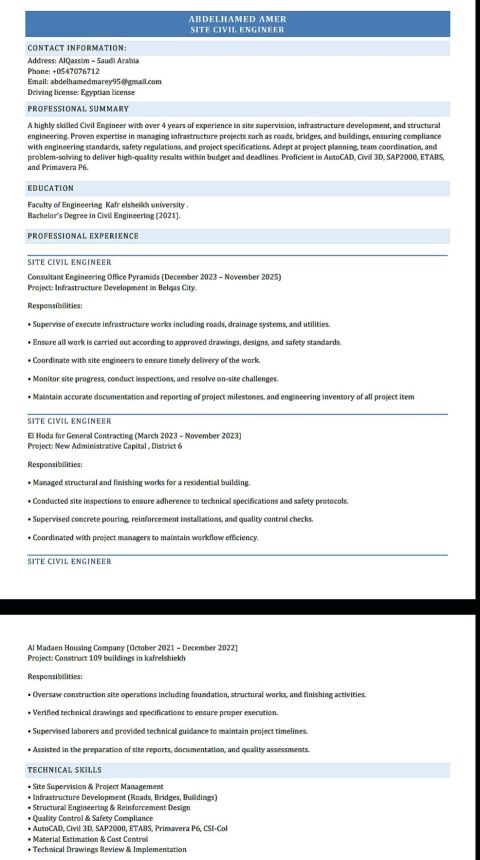 مهندس مدني خبرة كبيرة في إدارة وتنفيذ مشاريع الأبراج والمباني السكنية والإنشاءات الحكومية وتم العمل باشراف (الهيئة الملكية في الجبيل وينبع، شركة ارامكو، وزارة الداخلية والاسكان، وزارة التربية والتعليم) ومدير مشروع ومدير إنشاءات معتمد في الهيئة الملكية في الجبيل، اعمل كمدير مشروع / مدير موقع / مدير تنفيذ، خبرة في التنفيذ والاشراف علي المشاريع الخرسانية والمعدنية والتشطيبات والترميم والصيانة