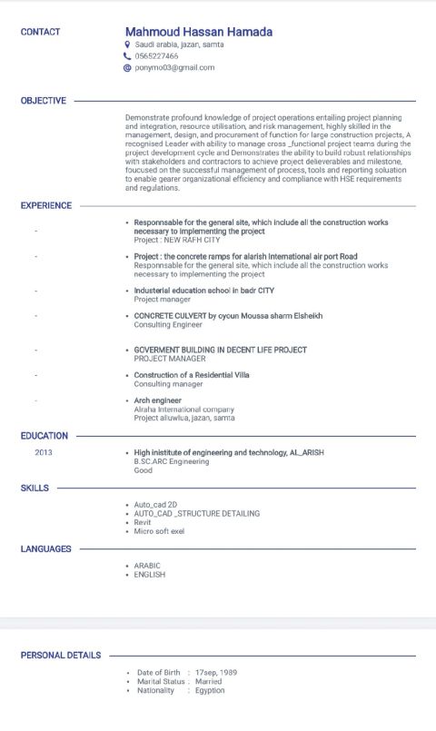 مهندس معماري مصري لدي خبرة 12 سنة في مجال التشطيبات الداخلية والخارجية ولدي خبرة ومهارات كافية في الاشراف ومتابعة جودة التنفيذ وضمان تسليم المشاريع في المواعيد المحددة حسب أعلى معايير وجودة مطلوبه ومتمكن في حل المشكلات الفنيه في الموقع بكفاءة عالية متواجد في المملكة ومتاح للتنقل