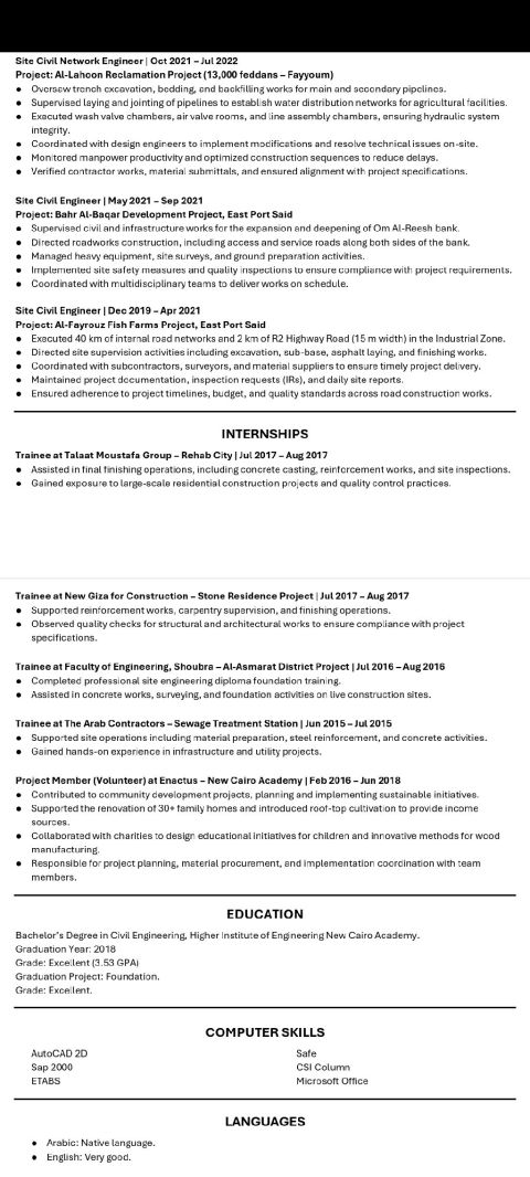 مهندس مدني بنية تحتية عملت فني تشغيل بمحطة مياه شمال حلوان سنة ونصف ثم عملت بمحطات الصرف الصحي فني تشغيل وصيانة الهندسية لمدة عام بشركة مياه القاهرة حاليا مدير التشغيل والصيانة بمحطة مياه شمال حلوان ذو كفاءة في التشغيل والصيانة لمحطات مياه الشرب والصرف الصحي أجيد تصميم الشبكات والمحطات خبرة ست سنوات بالاضافة الى مهندس تصميم بنية تحتية بمكتب مصر استشارات