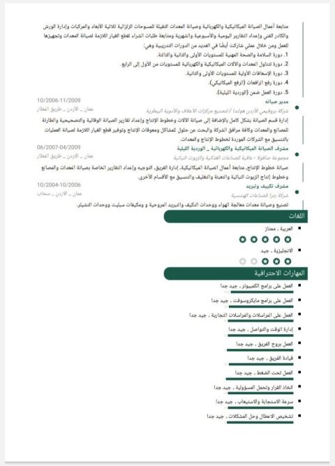 مهندس ميكانيكا خريج جامعة حكومية، حاصل على عضوية الهيئة السعودية للمهندسين خبرة في مجال المقاولات ومكافحة الحريق والتصميم والصيانة والتشغيل والتنفيذ في المشاريع وحصر الكميات وقراءة المخططات وعمل المستخلصات وتسليم المواقع، حاصل على شهادة دولية الأوشا ولدي رخصة قيادة وإقامة سارية (لا مانع لدي بالعمل في أي منطقة في السعودية)