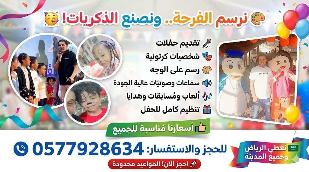 بنقدم لكم تقديم حفلات (أعياد ميلاد - نجاح - فعاليات خاصة وعامة) شخصيات كرتونية ترسم البسمة على وش الاطفال رسم على الوجه (Face Painting) سماعات وصوتيات عالية الجودة ألعاب وفقرات ترفيهية ومسابقات توزيع هدايا وتنظيم كامل للحفل أسعارنا مناسبة للجميع بنغطي الرياض وجميع مدن المملكة هنفرح أولادكم ونصنع لهم ذكريات جميلة لأن الفرحة الحقيقية تبدأ من ضحكة طفل للحجز