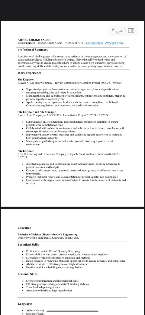 مهندس مدني خبرة في الهياكل والتشطيبات 1 - الاشراف على التنفيذ (عظم + تشطيب) 2 - استلام الأعمال المنفذة وضبط جودة التنفيذ خبرة في إدارة الموقع وتوزيع العمالة على بنود الأعمال في الموقع + متابعة المواد الموردة والمستهلكة في الموقع والرفع بالتقارير الفنية ونسبة الانجاز واعداد جداول حصر الكميات مراجعة المخططات ومطابقتها وتسليم الاستشاري ومطابقة مواصفات المواد ملم بالكود السعودي. إقامة سارية ورخصة قيادة