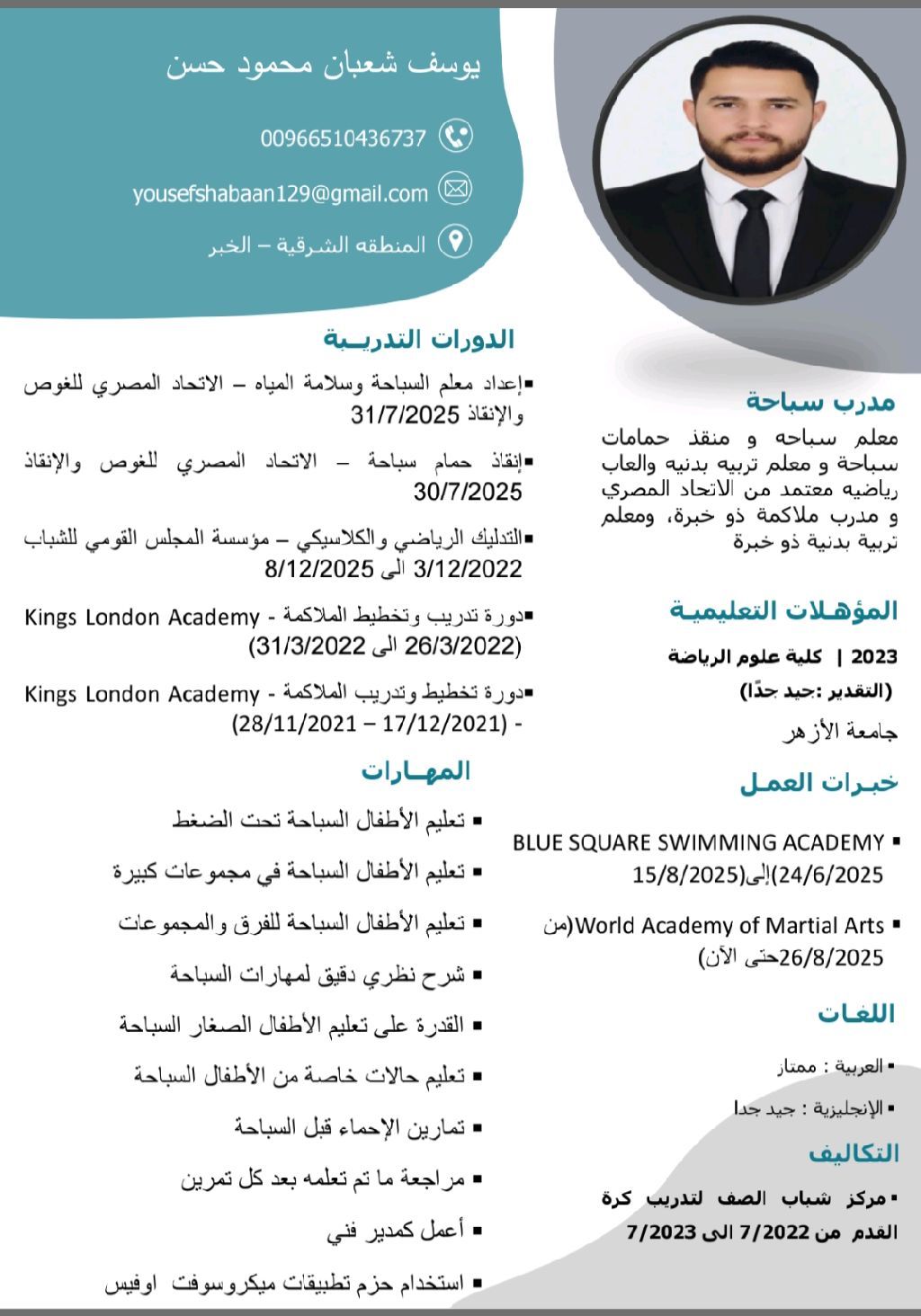 مدرب سباحة ذو خبرة ومدرب لياقة بدنية ذو خبرة مدرس ألعاب رياضية أكثر من سنتين