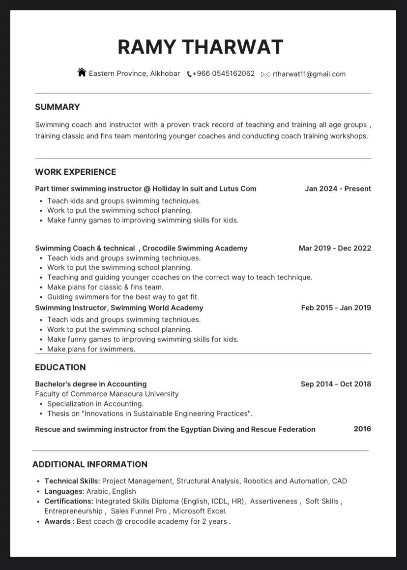 تكنيكال ومدرب سباحة خبرة 12 عام في تعليم وتدريب السباحة لجميع المراحل السنيه وادارة الأكاديميات من تسجيل وحصر وتدريب فرق السباحة زعانف وكلاسيك متواجد بالخبر. إقامة سارية