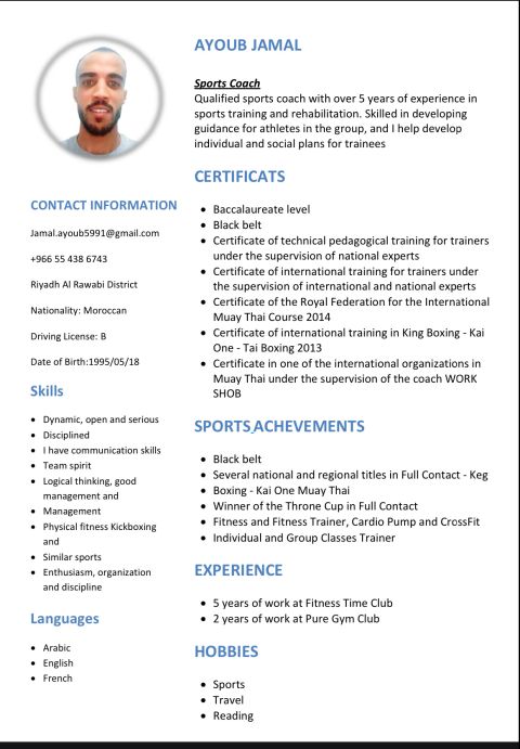 أنا أيوب جمال مدرب رياضي في اللياقة البدنية والحصص الجماعية وكور وس فيت والكيك بوكسن والم وأي طاي ولاعب دولي سابق دوخبرة في وقت اللياقة 5 سنوات و2 سنة في بيورجيم