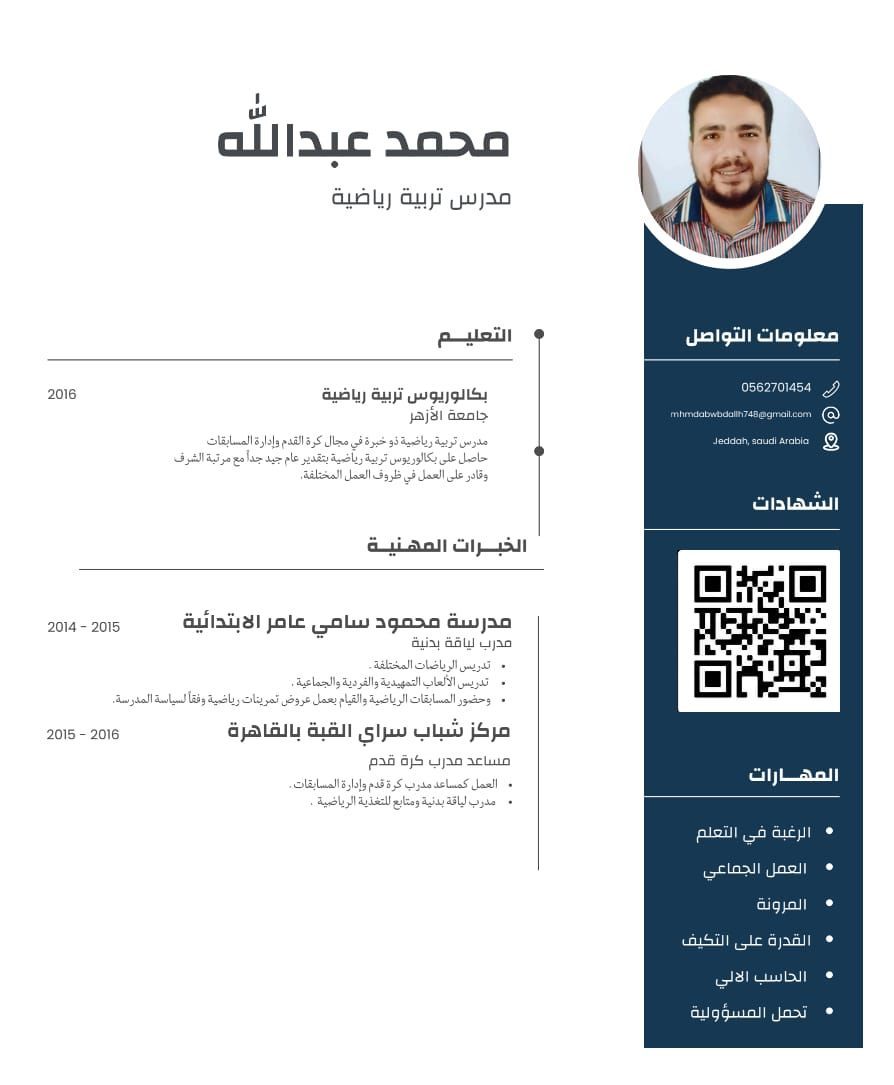 الاسم/ محمد عبدالله محمد مقيم في جدة حاصل على بكالوريوس التربية الرياضية بنين في القاهرة جامعة الأزهر بتقدير عام جيد جدا مع مرتبة الشرف خبرة في مجال إدارة المسابقات كرة القدم ومساعد تربية رياضية التميز بالاتقان في العمل والالتزام والجدية والمرونة الرغبة في التعلم والعمل الجماعي ابحث عن أي وظيفة مناسبة وأنا جاهز إن شاء الله للعمل في أي مكان بالمملكة