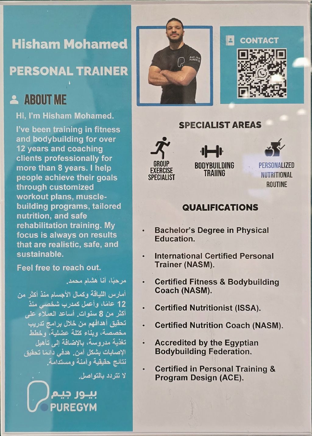 مدرب شخصي اونلاين ومدرب شخصي في بيور جيم فرع المنصورية والحين يوجد خصومات 30% على اشتراكات النادي بأسعار رمزيه، منتظركم يا أبطال في بيور جيم فرع المنصورية