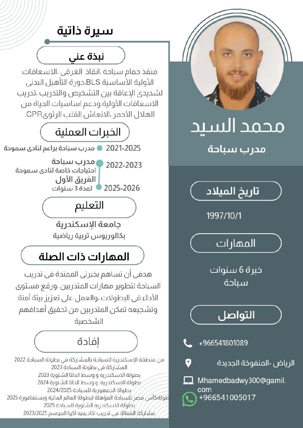مدرب سباحة معتمد ومنقذ ومتخصص في الاحتياجات الخاصة خبرة 6 سنوات وحاصل علي شهادة الانقاذ والاسعافات الأولية من الهلال الأحمر والإنعاش القلبي الرئوي CPR, والتأهيل البدنية لشديد الاعاقة، مقيم بالمملكة العربية السعودية