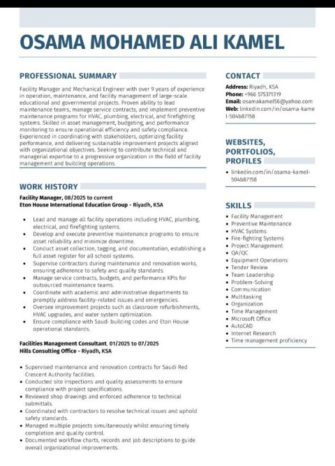 Facilities Manager and Mechanical Engineer with 9 + years of experience. Strong background in KSA with the Saudi Red Crescent Authority and Eton House International Schools as a Facilities Manager. Skilled in O M for HVAC, firefighting and plumbing systems. Experienced in MEP site execution, and managing central workshops and equipment maintenance at Arab Contractors. Based in Riyadh and available