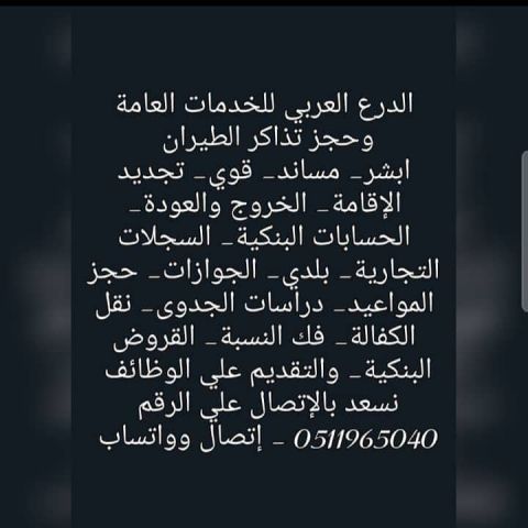 الدرع العربي للخدمات العامة تواصل عن طريق الواتساب لانجاز جميع الخدمات الالكترونية العامة الجوازات - مكتب العمل السجلات التجارية قوي مساند المقابل المالي الضريبة والدخل وأيضا خدمات دراسات الجدوى وحجز تذاكر الطيران والبحوث الطلابية