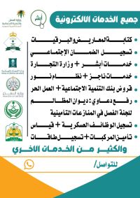 خدمات ابشر منصة قوى مكتب العمل خدمات الجوازات - خدمات بلدي - فرص - أجير عقد الكتروني التأمينات الاجتماعية - مدد وأجور حماية الأجور - خدمات وزارة التجارة - المركز السعودي للأعمال تأمين مركبات رفع مطالبات التعويض من التأمين خدمات نجم وزارة العدل - ناجز - رفع دعوي - عمل وكالة الكترونية تجديد الصكوك الضمان الاجتماعي المطور وثيقة العمل الحر دعم ريف - حساب المواطن