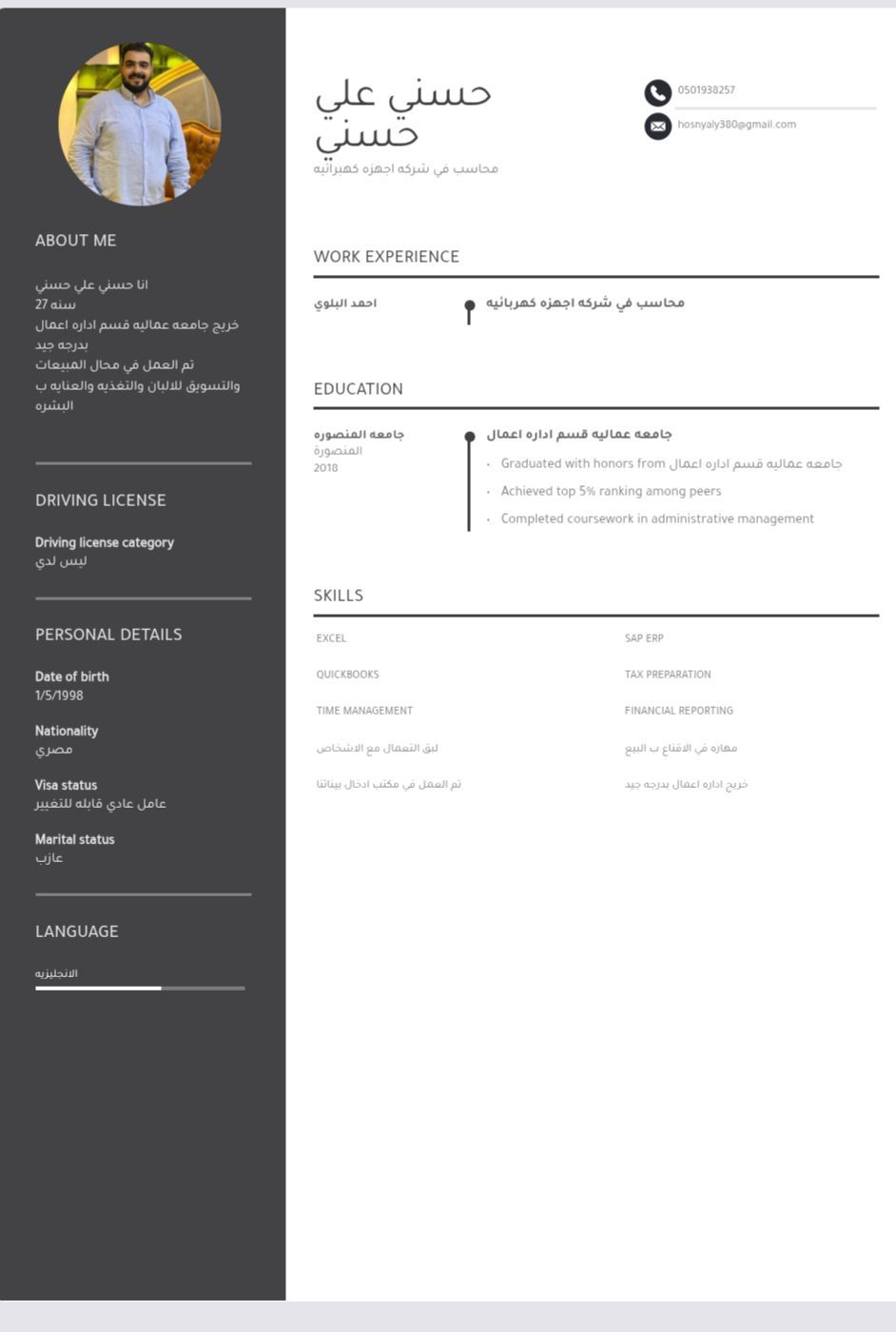 اسمي حسني علي 27 سنة مصري كلية ادارة أعمال تم العمل من قبل في مندوب مبيعات في مصر مواد التغذية وتم العمل في مجال الادوية وتم العمل في فندق لمدة 3 سنوات مساعد شيف لبق الحديث مع العملاء