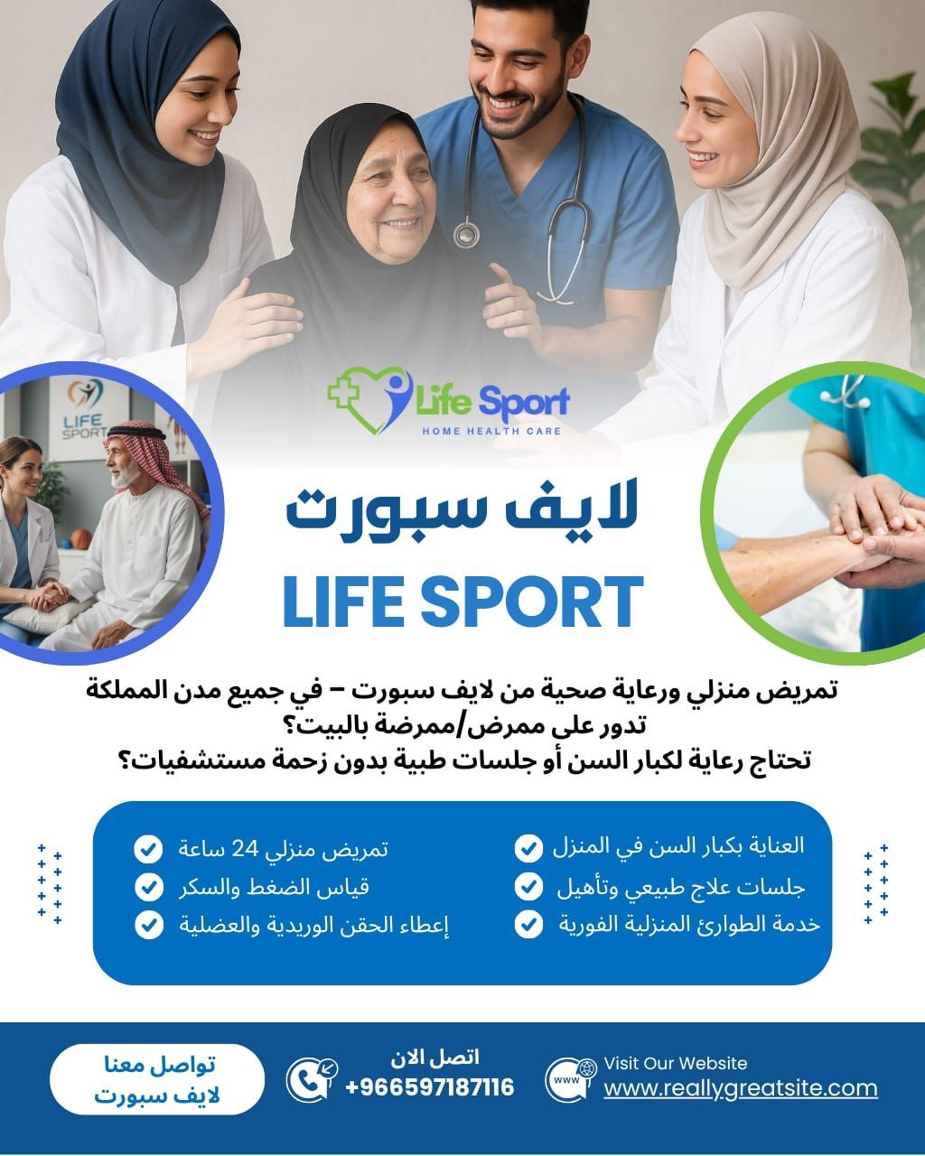 تمريض منزلي ورعاية صحية من لايف سبورت - في جميع مدن المملكة تدور على ممرض / ممرضة بالبيت تحتاج رعاية لكبار السن أو جلسات طبية بدون زحمة مستشفيات مع لايف سبورت نوفر لك أفضل خدمات الرعاية الصحية المنزلية على مدار الساعة، عن طريق فريق طبي سعودي وعربي مرخص وذو خبرة كبيرة. خدماتنا تمريض منزلي 24 ساعة/ زيارات يومية قياس الضغط والسكر ومتابعة الحالات اعطاء الحقن الوريدية والعضلية العناية
