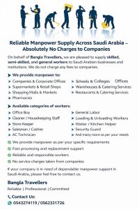We provide skilled, semi - skilled, and general workers according to demand anywhere in Saudi Arabia