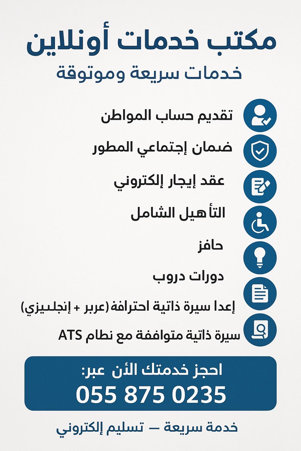 مكتب خدمات اونلاين خدمات سريعة وموثوقة - تقديم حساب المواطن - ضمان اجتماعي المطور - عقد إيجار الكتروني - التأهيل الشامل - حافز - دورات دروب - اعداد سيرة ذاتية احترافية (عربي + انجليزي) سيرة ذاتية متوافقة مع نظام ATS احجز خدمتك الآن عبر خدمة سريعة تسليم الكتروني