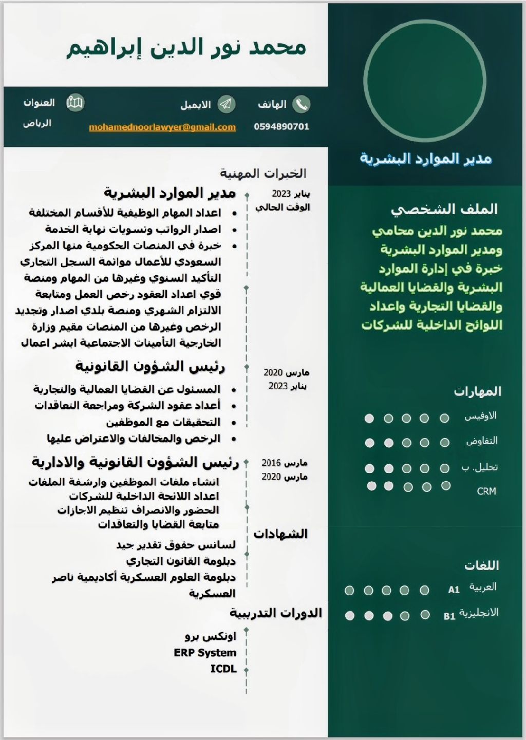مدير موارد بشرية خبرة في اعداد الرواتب والمسيرات وتسويات نهاية الخدمة والاجازات والخطابات والمنصات الحكوميه ومتابعة الالتزام الشهري وغيرها من مهام الموارد البشرية والقضايا العمالية والقضايا التجارية