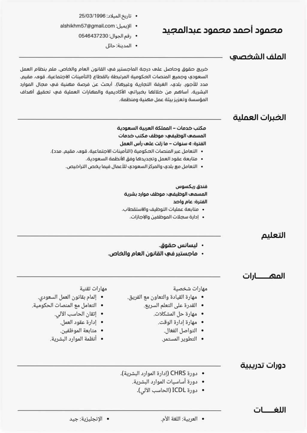 ابحث عن عمل بالموارد البشرية خبرة أربعة سنوات بالعمل على المنصات الحكوميه مدد ومقيم والتأمينات والغرفة التجارية حاصل على ماجستير في القانون العام والخاص وحاصل على دورة أخصائي الموارد البشرية المعتمد عندي رغبة قوية لتنمية مهاراتي الأكاديمية في بيئة عمل محفزة