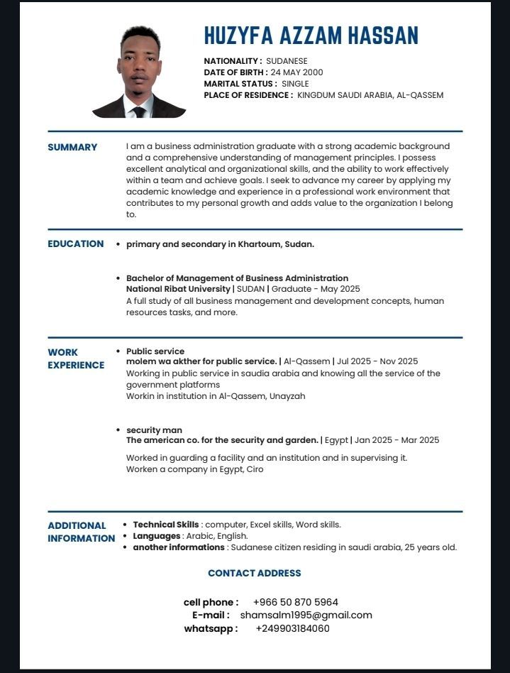 أنا سوداني شاب 25 سنة خريج ادارة أعمال وعندي خبرة في المنصات الحكومية ولغتي الانجليزية ممتازة وعندي مهارات كبيرة جدا في برامج Excel وword وعندي معرفة بمهام الموارد البشرية