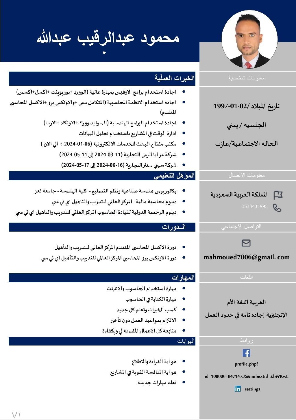 مهندس صناعي خريج هندسة صناعية ونظم التصنيع لدي خبرة سنتين في امور التعقيب اشتغلت بمكتب خدمات عامة (التأمينات الاجتماعية + قوي + هيئة الزكاة والدخل والضريبة + مدد + وزارة التجارة + وزارة البلدية) كل ما يشمل امور التعقيب لدي خبرة في الاكسل المحاسبي المتقدم ولدي شهادة المحاسبة المالية
