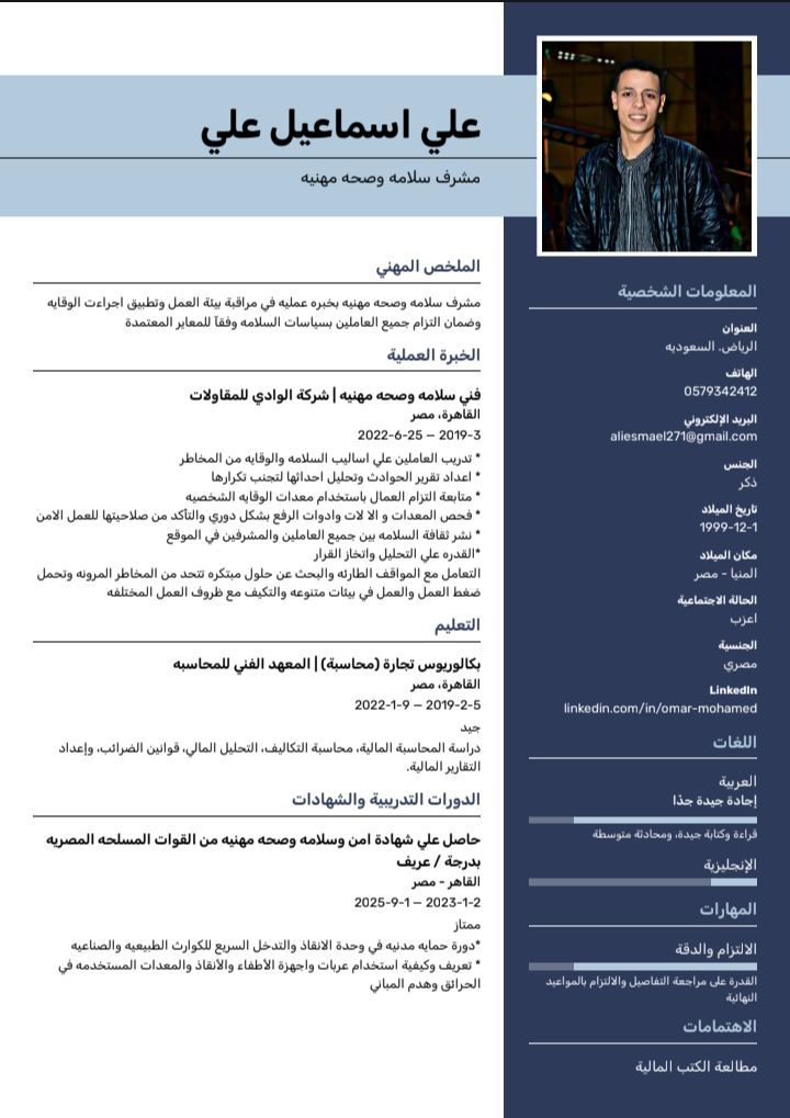 مشرف سلامه وصحة مهنية بخبرة عملية في مراقبة بيئة العمل وتطبيق اجراءات الوقاية وضمان التزام جميع العاملين بسياسات السلامة وفقآ للمعايير المعتمدة حاصل علي شهادة أمن وسلامه وصحة مهنية للحماية المدنيه من القوات المسلحه المصريه بدرجة / عريف. تدريب العاملين علي أساليب السلامة والوقاية من المخاطر اعداد تقرير الحوادث وتحليل أحداثها لتجنب تكرارها محترف في استخدام معدات الاطفاء والانقاذ. ت 0579342412)