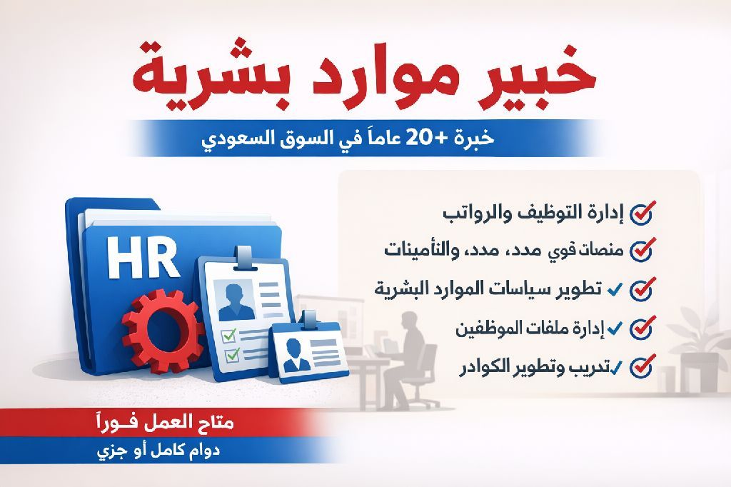 حاصل على ماجستير إدارة الأعمال موارد بشرية ومحاسب مصري الجنسية بخبرة 20 عام داخل السعودية، أجمع بين الإدارة المالية وإدارة شؤون الموظفين بكفاءة عالية. خبرة في التقارير المالية، VAT، ERP، وإدارة الرواتب والملفات الوظيفية ومنصات الحكومة مثل قوى، مدد، والتأمينات. حاصل على MBA وCFM وعضو SOCPA. متاح للعمل فورا