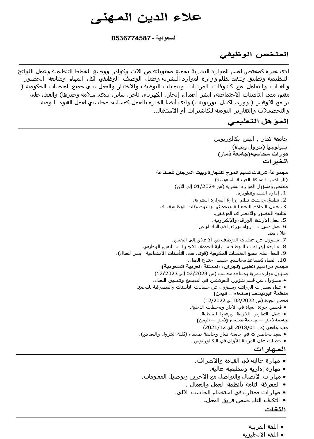 مختص موارد بشرية يمني الجنسية خبرة 4 سنوات في مجموعة شركات تشمل عدة قطاعات تجارية وخدمية وصناعية ومتمكن من التعامل جميع المنصات الحكومية وانشاء الدورة المستندية الخاصه بقسم الموارد وانشاء السياسات التشغيليه والتوصيفات وعمليات الاستقطاب وعمل مسيرات الرواتب ودورة التوظيف للموظف كاملة من المباشرة الى انهاء الخدمات واحتسابها. ومساعد حسابي في القيود اليومية ومساعدة قسم الحسابات عند الحاجة