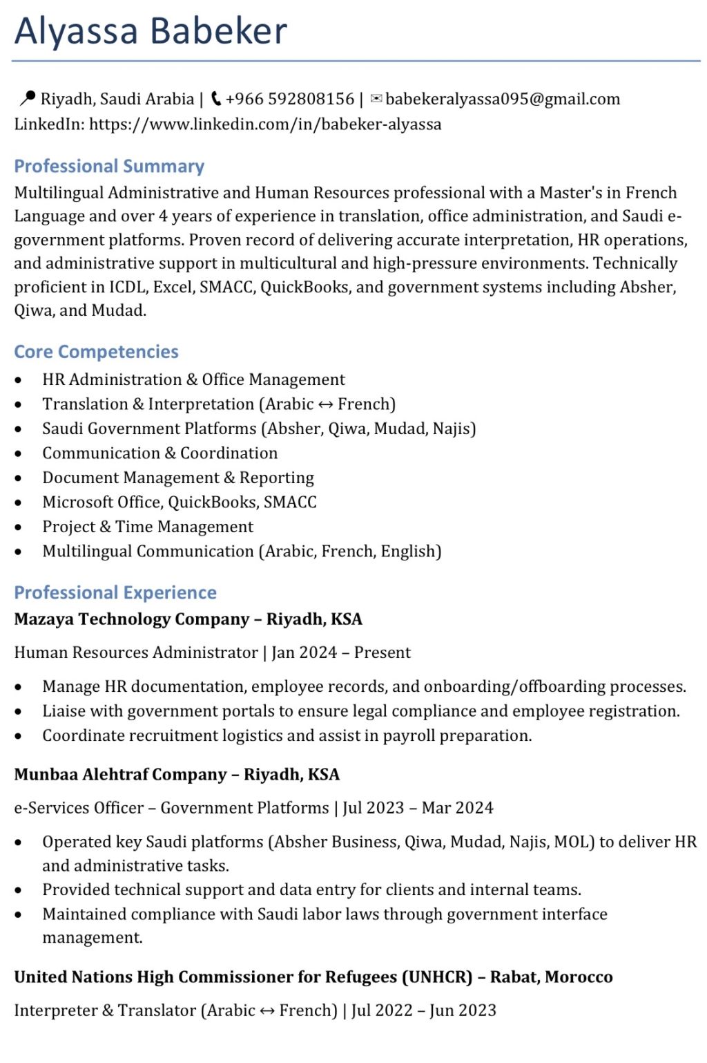 اليسع بابكر سوداني الجنسية موظف موارد بشرية وخدمات عامة المؤهل التعليمي ماجستير الخبرات العملية على جميع منصات المؤسسات والشركات (قوى ابشر أعمال مقيم مدد المركز السعودي للأعمال بلدي منصة تم منصة اعتماد) كذلك خبرة بادارة الموظفين الحضور والانصراف الرواتب المخالصات والانهاءات العقود وتحديث الملفات متواجد في الرياض وليس لدي مانع للانتقال للشرقية أو المدينة المنورة
