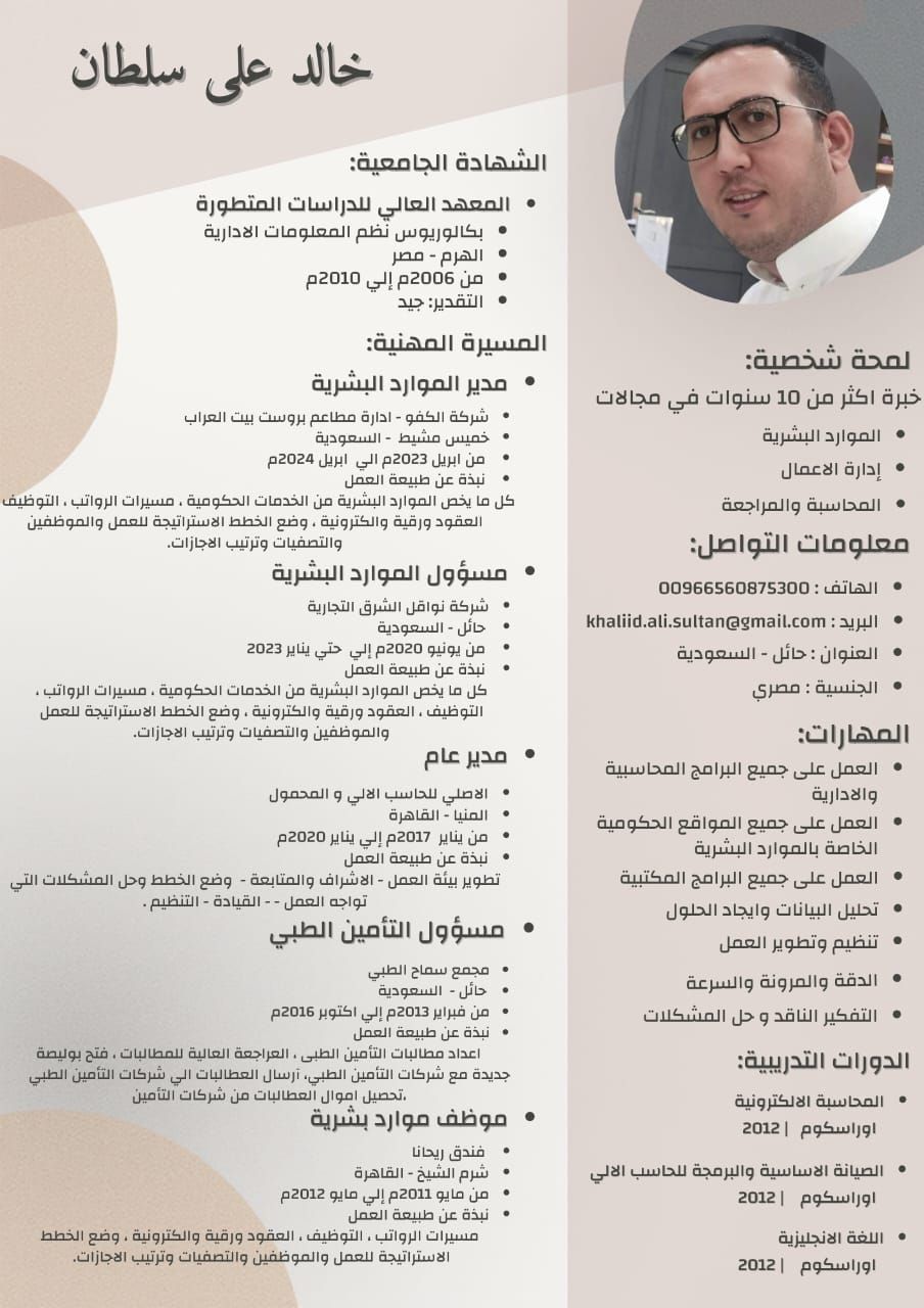 ابحث عن عمل مدير أو أخصائي موارد بشرية خبرة أكثر من 5 سنوات ملم بجميع المنصات الحكوميه والأعمال المكتبية والادارية والرواتب وحماية الأجور وقوي ومقيم والتأمينات الاجتماعية وبلدي وابشر ووزارة التجارة وناجز ومكتب العمل وجميع ما يخص الموارد والعمل على جميع البرامج الخاصة بالموارد البشرية ومسيرات الرواتب وبدل الاجازات ونهاية الخدمة وملم بقوانين مكتب العمل ومتابعة الحضور والانصراف والبصمة والعقوبات