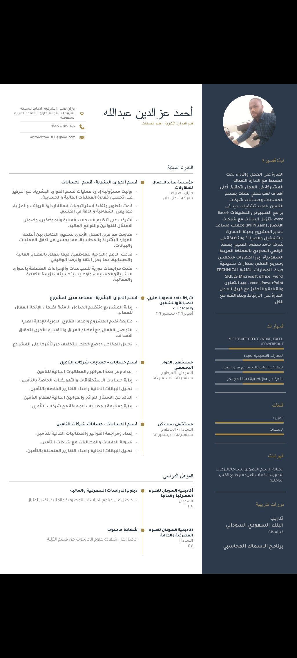 سوداني الجنسية ابحث عن وظيفة عملت بشركة مقاولات العقد الموحد الهيئة السعودية للكهرباء. وشركة صيانة وتشغيل بالعقد الموحد الجمارك. تنظيم الفرق الميدانيه والخطط الوقائية ومساعد لمدير المشروع واعداد المستخلصات الشهريه مع الاستشاري. كما عملت بقسم الموارد البشرية ولدي خبرة بالمنصات الحكوميه قوي تأمينات ابشر. الخ. خبرة 5 سنوات