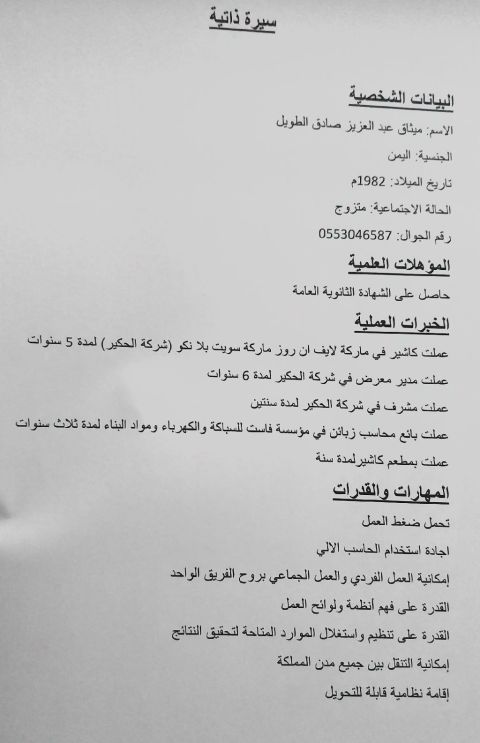 مصطفى 27 سنة مقيم في الدمام الإقامة سنة سارية لديه خبرة كبيرة في الإدارة والموارد البشرية وExcel'word وعملت في مكتب خدمات ولدي خبرة كبيرة في المنصات الحكوميه مثل (قوي - ابشر أفراد - ابشر أعمال - مقيم - ناجز - بلدي - المركز السعودي للأعمال - مساند - مدد - هيئة الزكاة والضربية والتأمينات الاجتماعيه) وكثير من المنصات الأخري