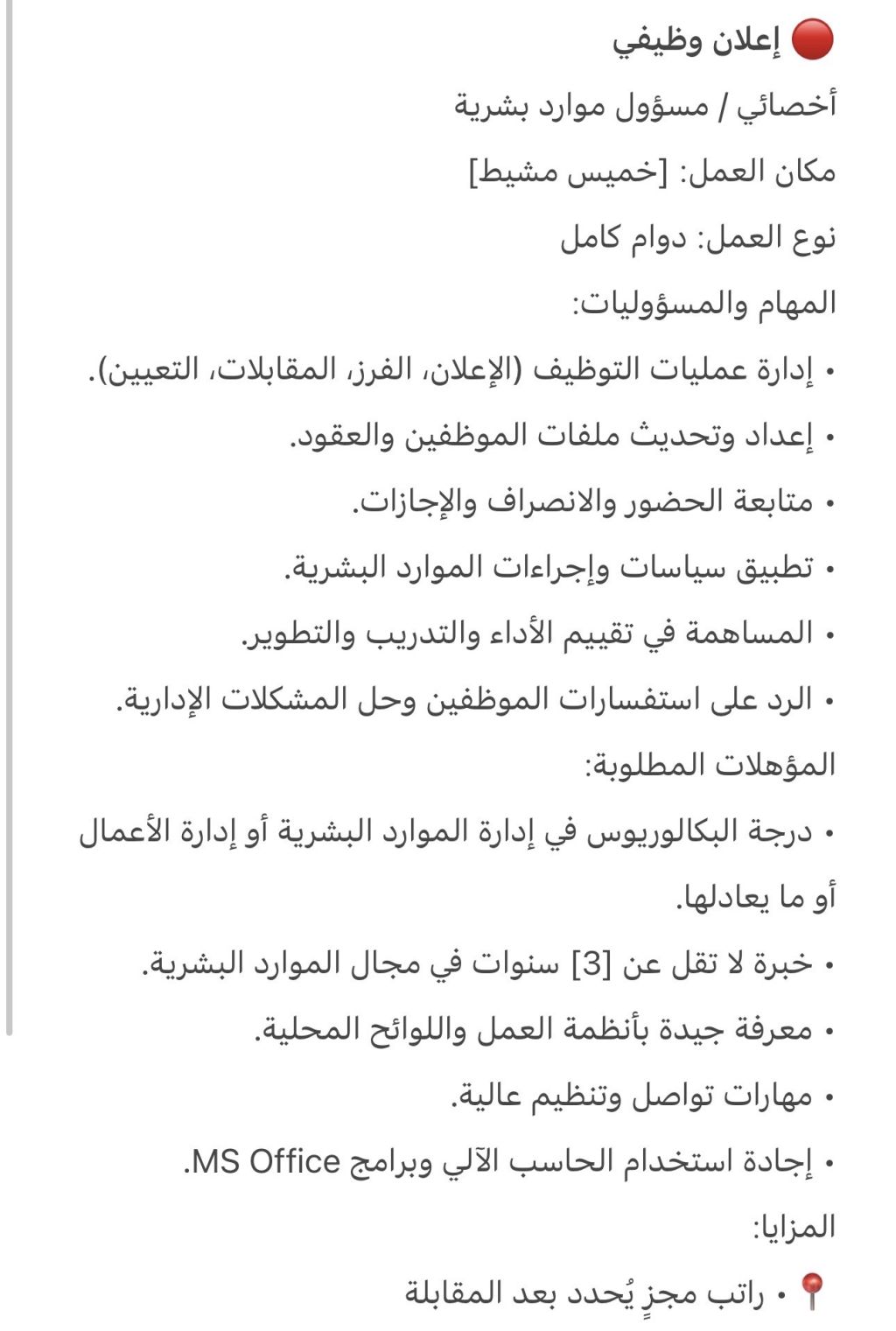 نرجو قراءة الاعلان جيدا مطلوب موظف HR للعمل في شركة في خميس مشيط المطلوب موضح بالصورة أعلاه