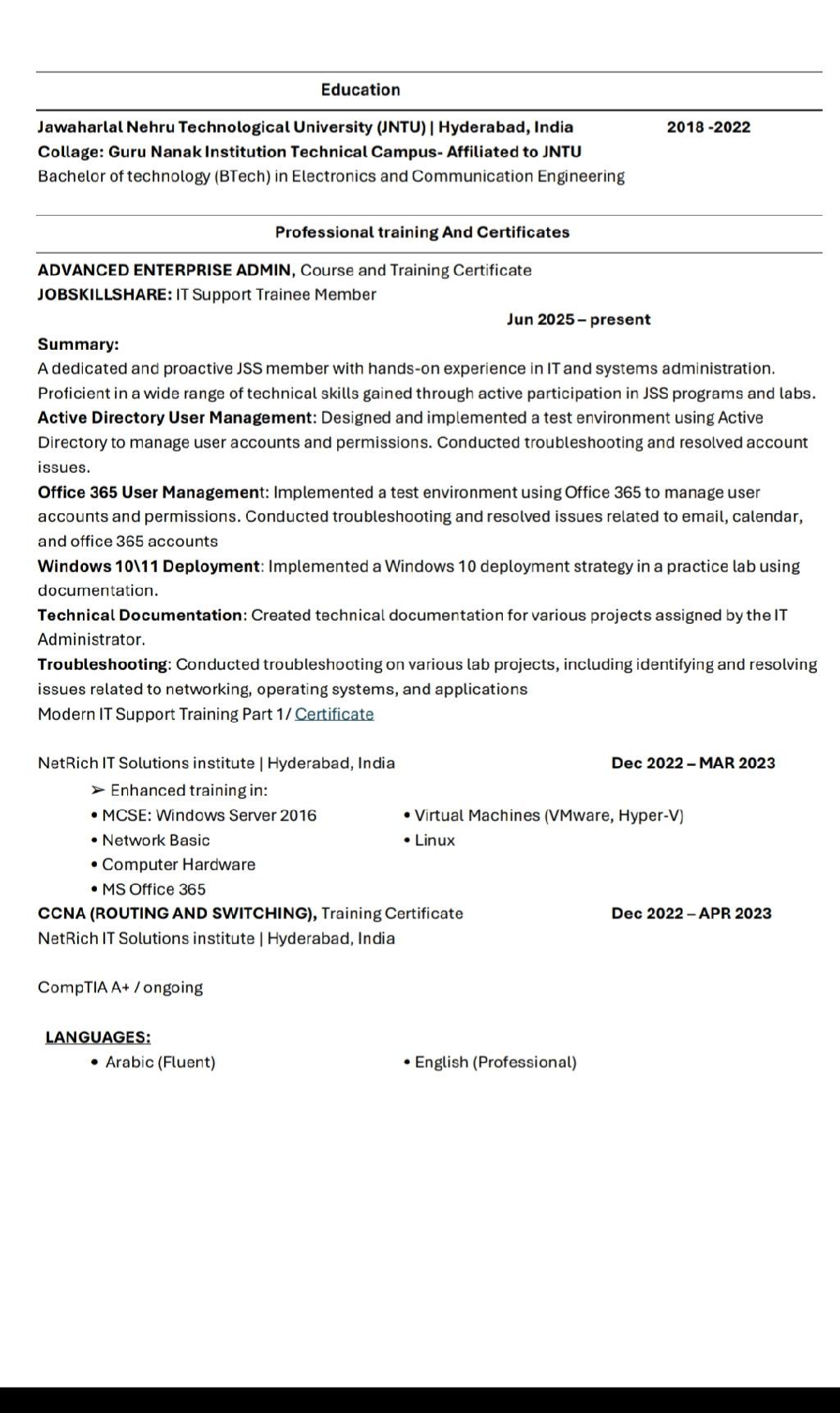 IT support & Networking IT professional with a strong interest in IT support, networking, and system administration. I possess a solid foundation in CCNA fundamentals, Windows environments, and Active Directory, and I continually practice through labs to refine my hands - on skills