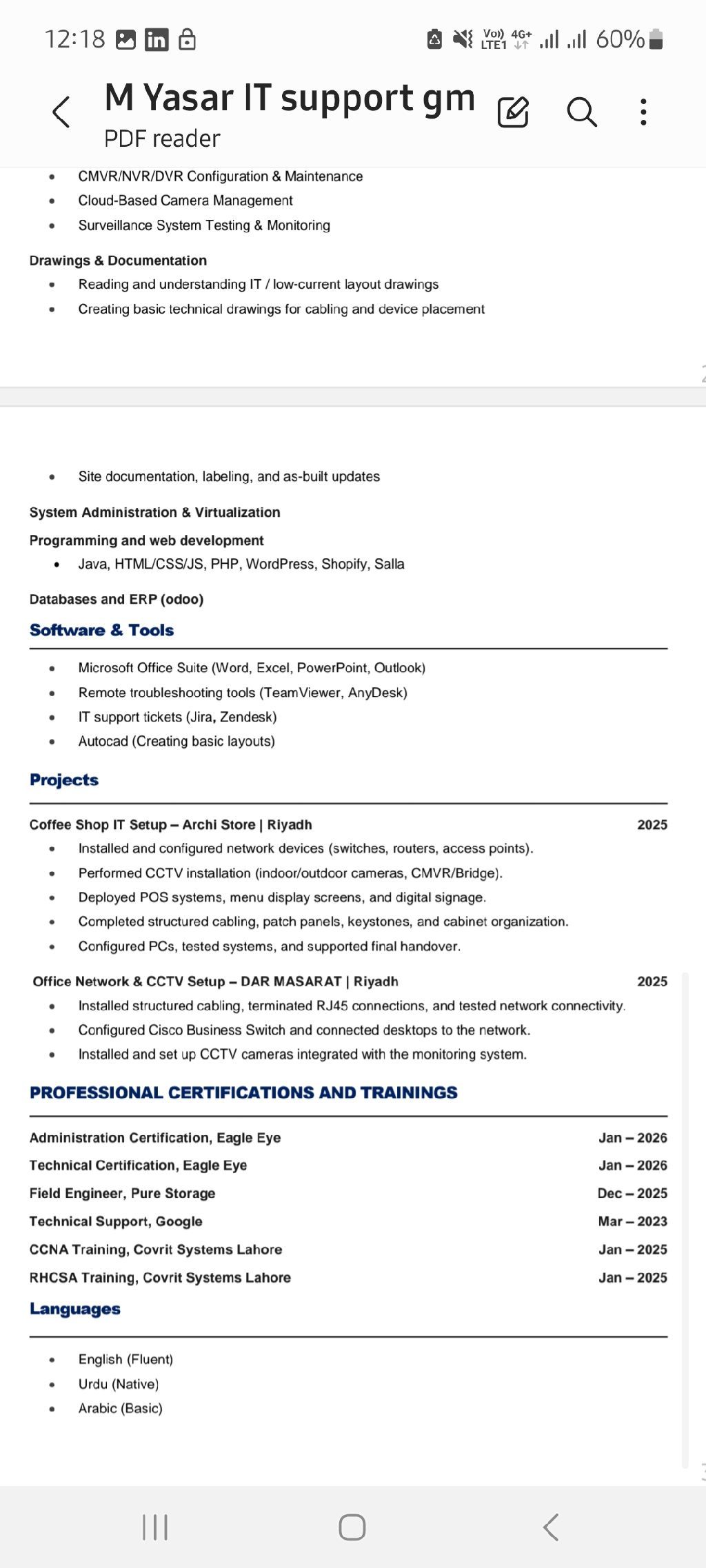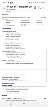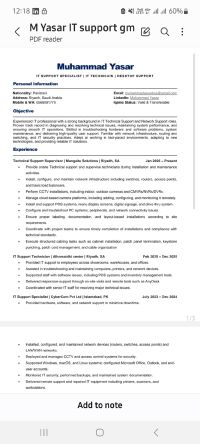 أخصائي دعم فني حاصل على شهادة بكالوريوس في تقنية المعلومات مع خبرة تزيد عن سنتين في دعم تكنولوجيا المعلومات والشبكات. ماهر في حل مشاكل الاجهزة والبرمجيات، إدارة أنظمة التشغيل، تكوين الشبكات، وتركيب أنظمة كاميرات المراقبة. يمتلك مهارات تواصل قوية وقدرة على حل المشكلات. جاهز للانضمام فورا