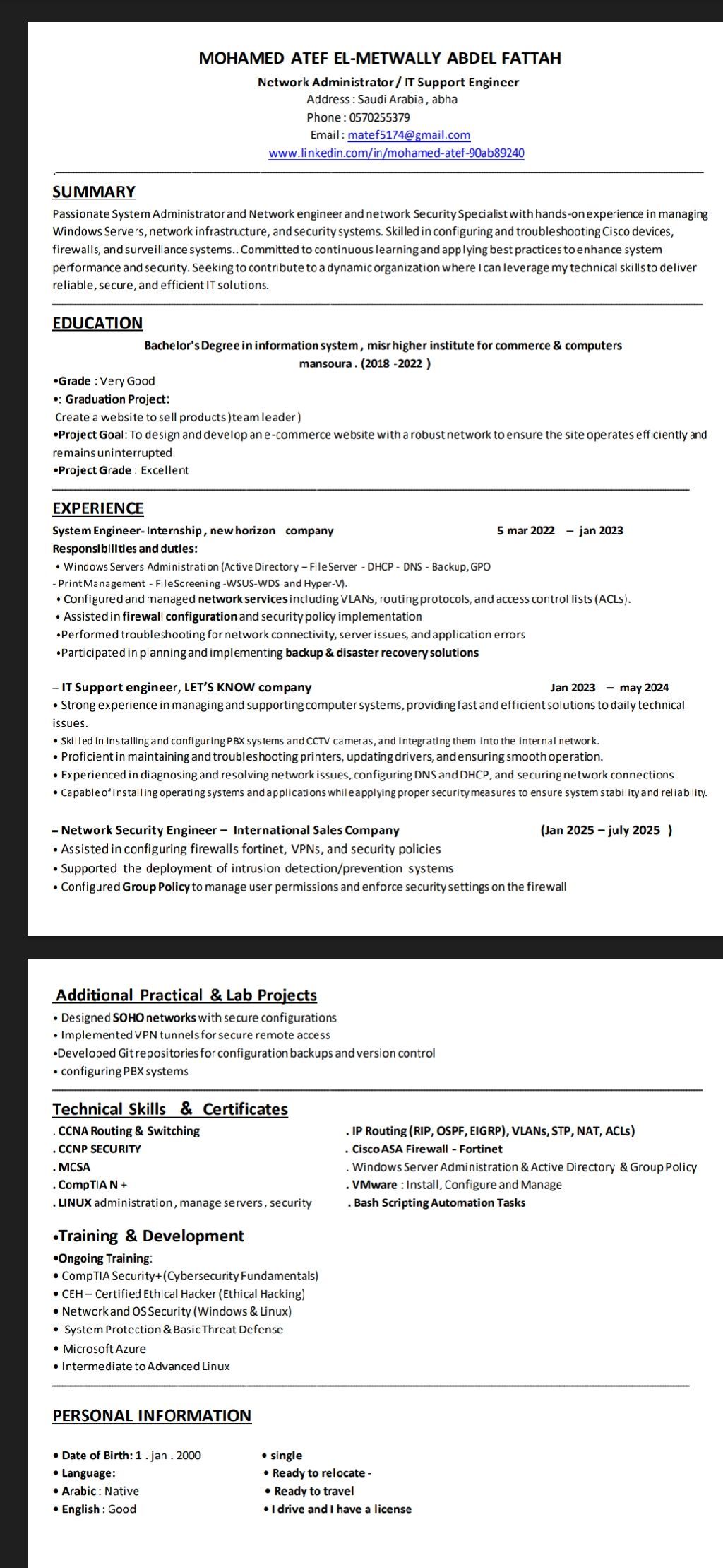 أنا مهندس IT'موجود في السعودية ومعيا إقامة بدور على شغل اشتغلت في مصر سنتين help desk وIT support وأخذ كورسات زي ccna & linux & mcsa & ccnp security (Asa) fortinet firewall & وعندي خبرة في ادارة السيرفرات وGPo والفاير وول وال vpn وخلفيه كبيرة في الكاميرات والسنترال الداخلي وحاليا بذاكر cloud (azure) وعندي خبرة في حل مشاكل اليوزر والسوفتوير والطابعات