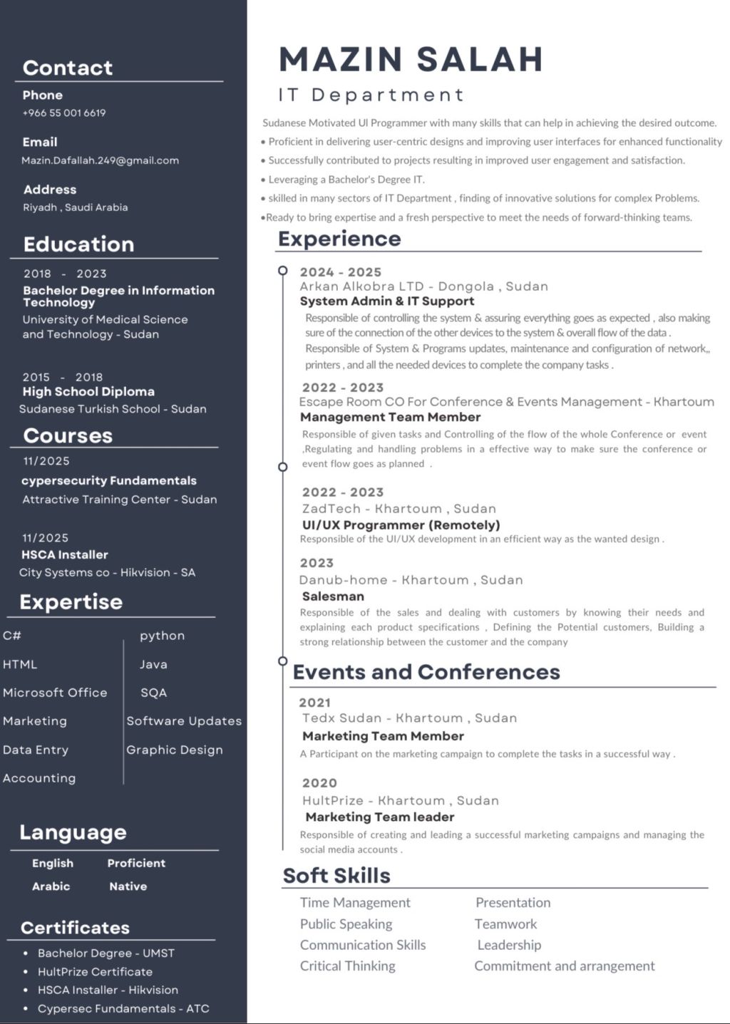 سوداني الجنسية (25 عاما) إقامة عمل سارية (ابحث عن عمل) اعمل في IT support، خدمة العملاء ادخال البيانات، تنظيم الفعاليات والمؤتمرات، البرمجة، المبيعات التسويق تصميم الملصقات والشعارات، تصميم المواقع، تركيب كاميرات، الدعم الفني. لدي خبرة عمل سابقة في السودان أجيد اللغة الانجليزية وكذلك التعامل مع الحاسوب بكفاءة عالية، مستعد للانتقال لأي منطقة داخل المملكة، تواصل للاجابة على جميع استفساراتك