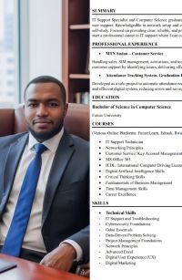 سوداني، حاصل على بكالوريوس علوم الحاسب، ابحث عن وظيفة في الدعم الفني، شبكات، ادخال أو غيره. لدي خبرة تتجاوز العام في خدمة العملاء قسم الدعم التقني والمبيعات، ملم بنظام Odoo وMicrosoft 365 Advanced Excel ومهارات في ادارة المشاريع، Troubleshooting وCRM وERP و E commerce اضافة الى مهارات التواصل وإدارة الوقت، وشهادات أخرى. أجيد الانجليزية، إقامة قابلة للنقل، مستعد للعمل فورا