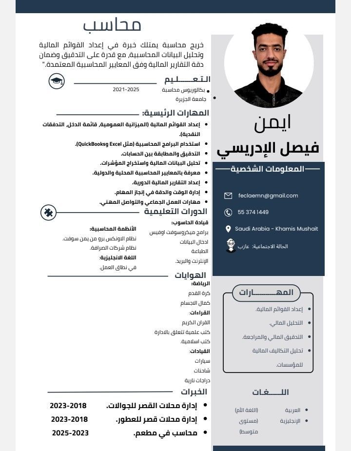 موجود حاليا في خميس مشيط. امتلك مهارات كثيرة في استخدام الحاسب وادخال البيانات. ونظام الأونكس برو. الطباعة سريع. وجميع برامج الأوفيس