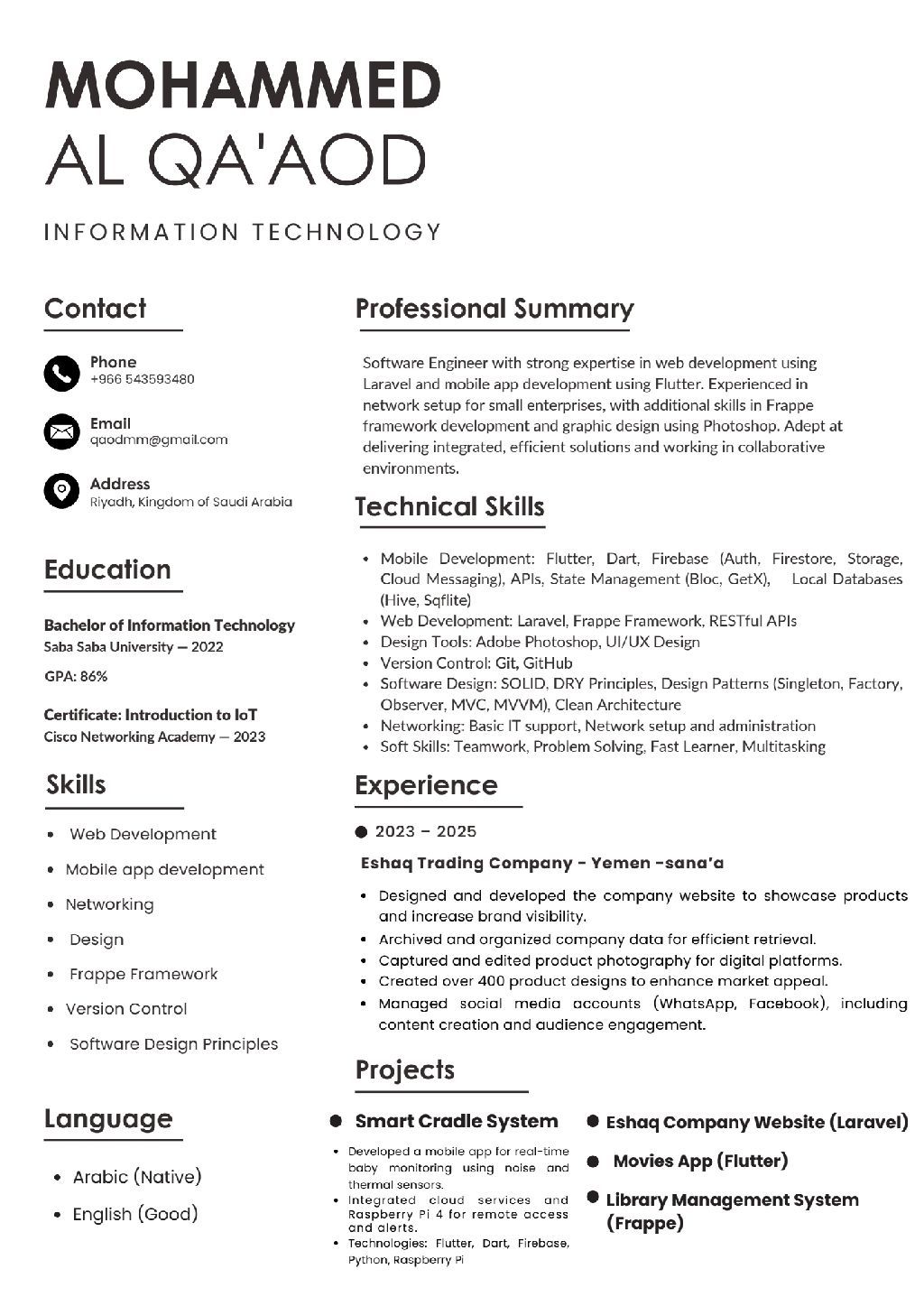 باحث عن وظيفة في مجال الكمبيوتر والشبكات - الرياض أنا محمد القعود، حاصل على بكالوريوس تقنية معلومات، ابحث عن وظيفة في مجال الكمبيوتر أو الشبكات. لدي خبرة في الدعم الفني، اعداد الشبكات، وتطوير التطبيقات باستخدام Laravel وFlutter، بالاضافة الى مهارات في التصميم وإدارة وسائل التواصل الاجتماعي. للتواصل