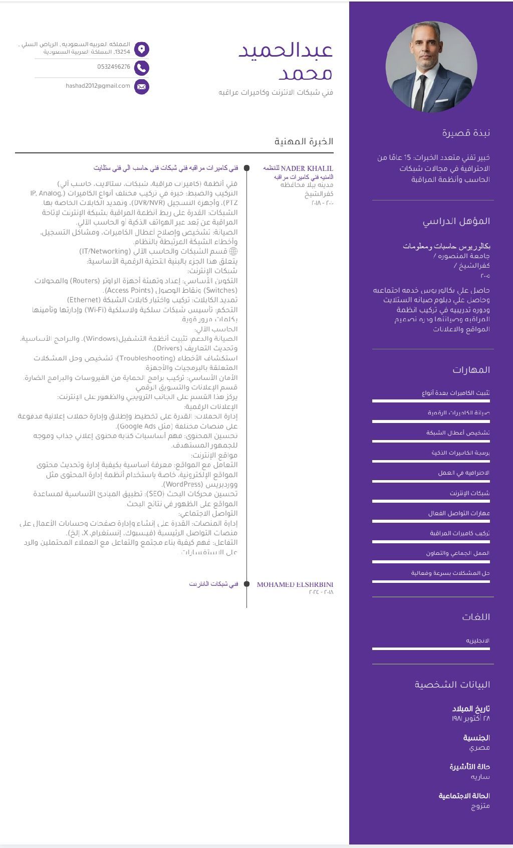 فني أنظمة (كاميرات مراقبة شبكات ستلايت حاسب الى) فني كاميرات مراقبه فني شبكات فني حاسب الى فني ستلايت التركيب والضبط خبرة في تركيب مختلف أنواع الكاميرات ( P Analog) PT2) واجهزة التسجيل (DVR / NVR) وتمديد الكابلات & القدرة على ربط أنظمة المراقبة بشبكة الانترنت